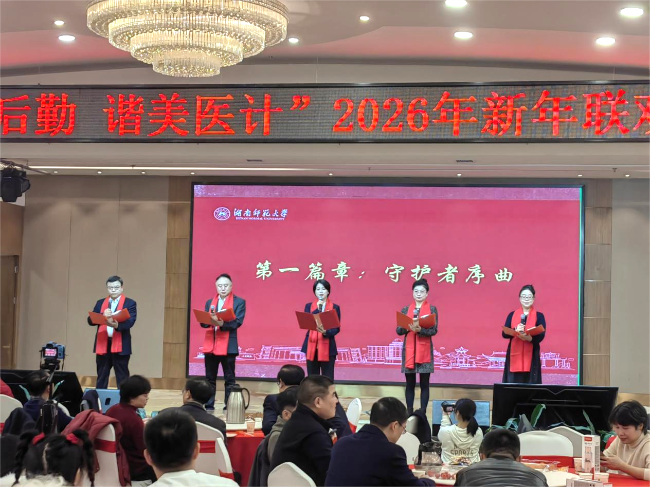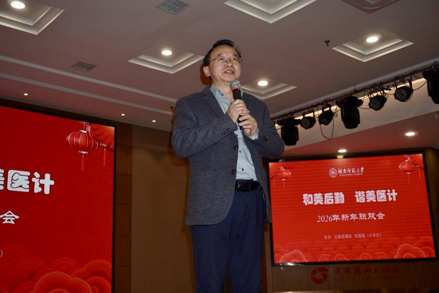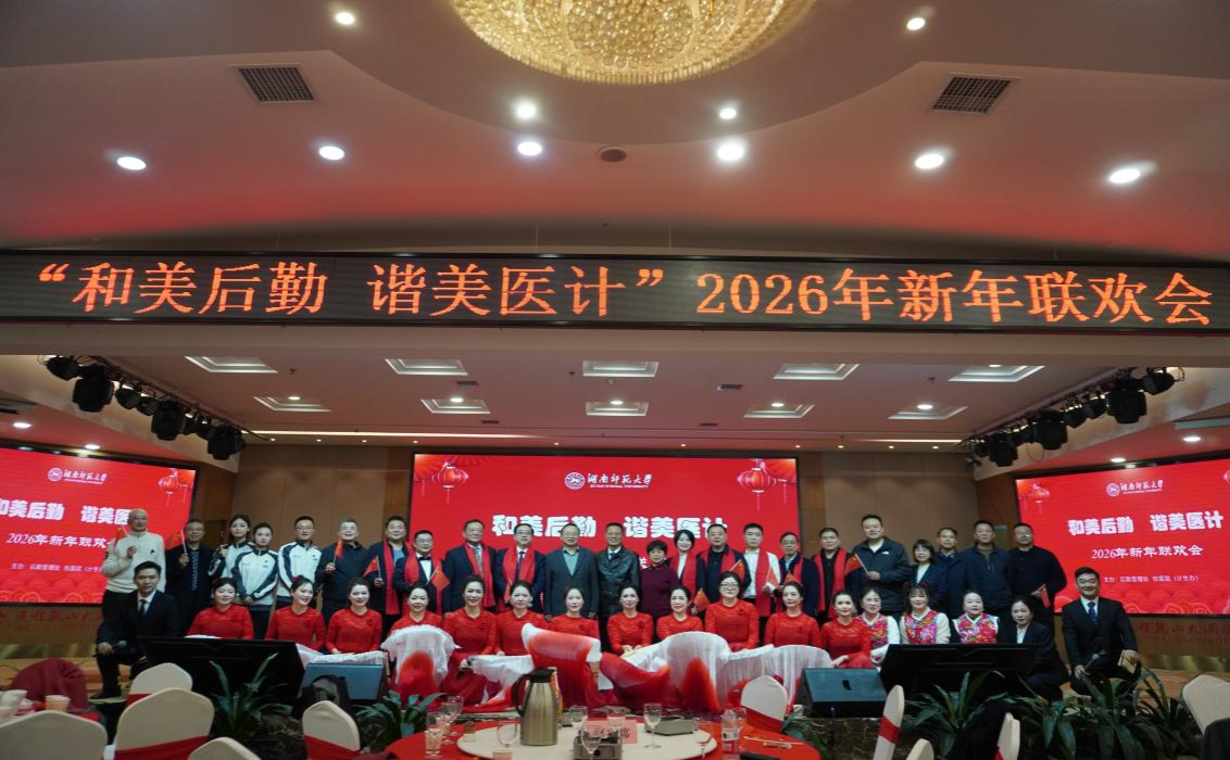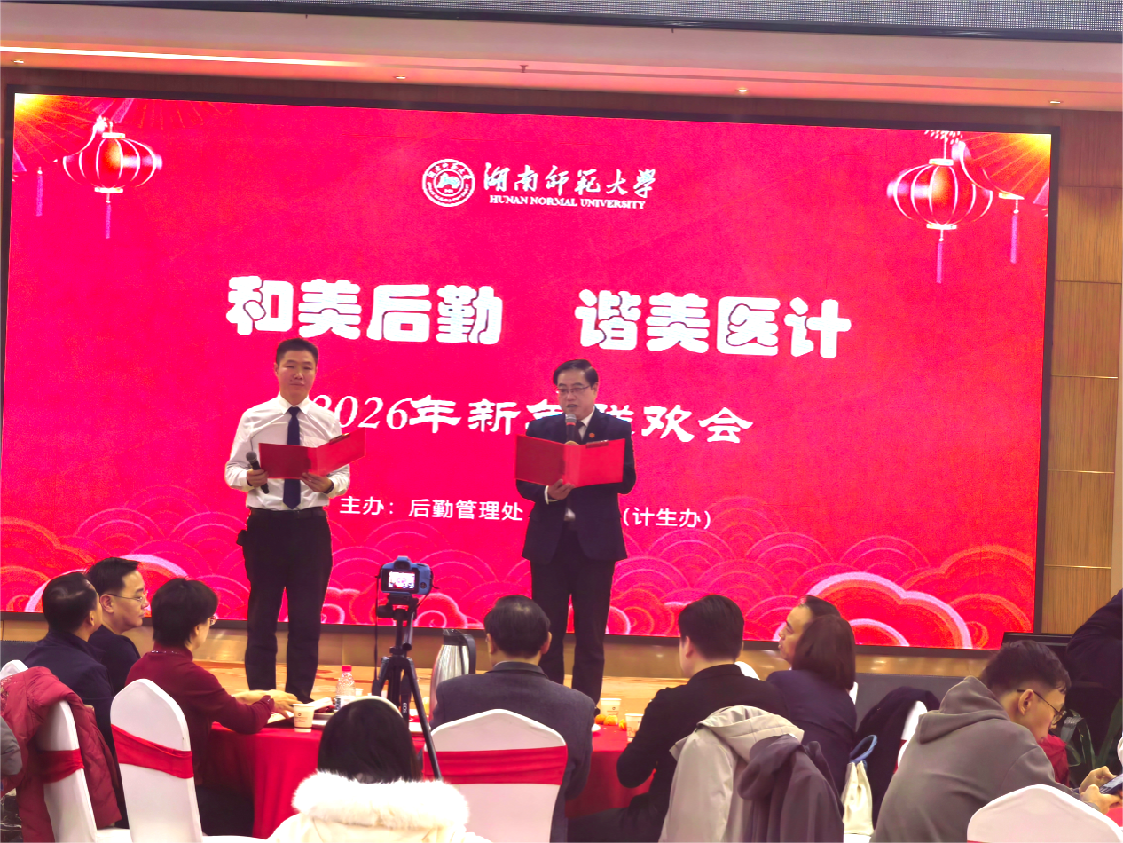 1月18日下午,我院与后勤管理处(后勤集团)联合举办的“2026新年联欢暨团拜会”在麓山宾馆湘江厅热闹上演。后勤处、校医院、基建处,科创港校区规划建设指挥部全体在职教职工及退休老同志代表欢聚一堂,共叙情谊,同迎新春。现场张灯结彩,笑语盈盈,浓浓的年味中更透出几分温馨与感动。